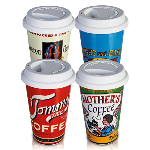 -. Title : 4x Porzellan Becher Coffee Brand to go in 4 Designs Kaffeebecher Kaffee für unterwegs mit Silikon Deckel
