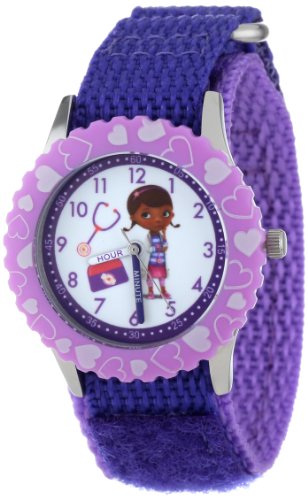 -. Binding : Watch -. Brand : Disney -. Color : purple -. Department : girls -. EAN : 0843231069985 -. Feature : Round Time Teacher Stainless Steel Watch with Disney's Doc McStuffins character on dial. / Meets or exceeds all US Govt requirements and regulations for Children's watches. / Recommended for Ages 3-7 years old. Includes a Time Teacher Punch Out clock for Parents to Teach their Children. / Accurate Japanese Quartz movement, scratch resistant mineral crystal, Hook and Loop Nylon strap. / Water Resistant to 99 feet: withstands rain and splashes of water, but not showering or submersion. / 1 Year Limited Manufacturers Warranty -. Label : Disney -. Manufacturer : Disney -. Model : W000909 -. MPN : W000909 -. PartNumber : W000909 -. ProductGroup : Watch -. ProductTypeName : WATCH -. Publisher : Disney -. ReleaseDate : 2013-07-08 -. Size : NO SIZE -. Studio : Disney -. Title : Disney Kids' W000909 "Doc McStuffins Time Teacher" Stainless Steel Watch with Purple Nylon Band -. UPC : 843231069985