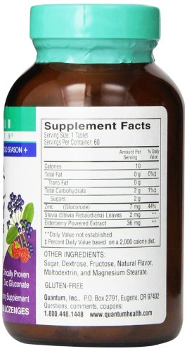 -. Binding : Health and Beauty -. Brand : Quantum -. EAN : 0046985017060 -. Feature : Contains the proven forms of zinc and elderberry - zinc gluconate and sambucus nigra studies show the many benefits of elderberry and zinc 200 mg of elderberry 7 mg of zinc gluconate natural raspberry flavor and sweeteners / These lozenges use the clinically studied zinc gluconate and the Sambucus Nigra from of elderberry / Manufactured in United states -. IsAdultProduct : 0 -. Label : Quantum Inc -. Manufacturer : Quantum Inc -. Model : FZINCELD60 -. MPN : 0046985017060 -. NumberOfItems : 1 -. PackageQuantity : 1 -. PartNumber : 0046985017060 -. ProductGroup : Health and Beauty -. ProductTypeName : HEALTH_PERSONAL_CARE -. PublicationDate : 2013-07-05 -. Publisher : Quantum Inc -. ReleaseDate : 2013-07-02 -. Size : Raspberry 60 Loz -. Studio : Quantum Inc -. Title : Quantum Health Thera Zinc Lozenges, Elderberry, 60 Count -. UPC : 046985017060