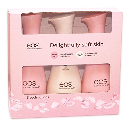The EOS Body Lotion value pack contains (3) 11.8 fl oz bottles with easy to use flip top, for a total of 35.4 oz of lotion. Included are 2 bottles of Berry Blossom scented lotion for normal skin, and 1 bottle of Vanilla Orchid scented lotion for dry skin.