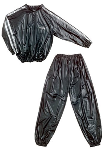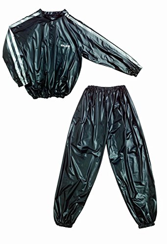Studio : Valeo Publisher : Valeo Binding : Sports Product Description Two-piece heavy-duty vinyl sauna suit retains body heat. Top features 3 snap placket closure, chest pocket and reflective striped sleeves for improved visibility. Pant features elastic waist and cuffs. Generously sized for easy movement. Wipes clean with a damp cloth. 0