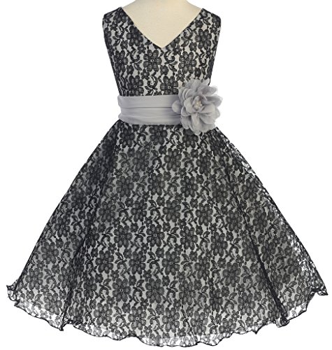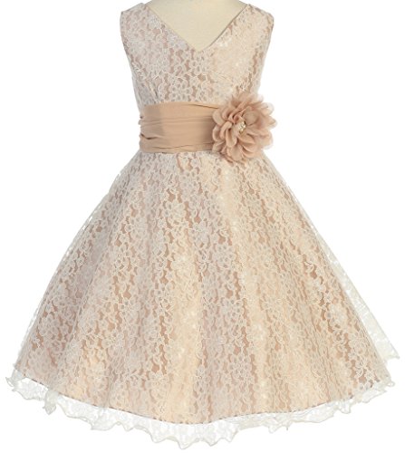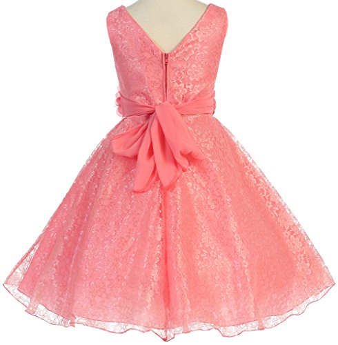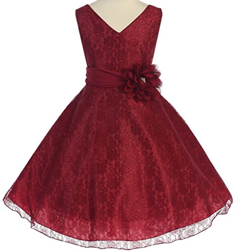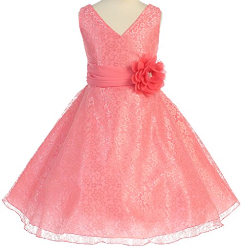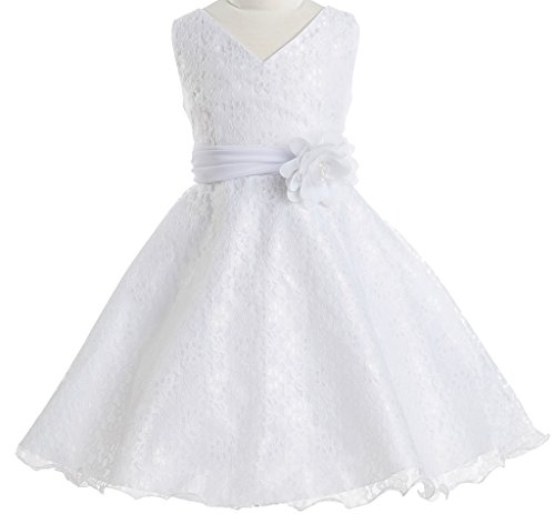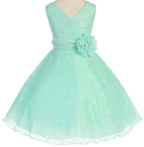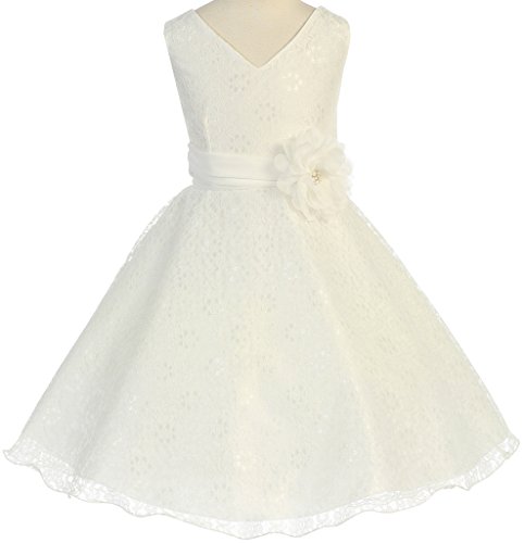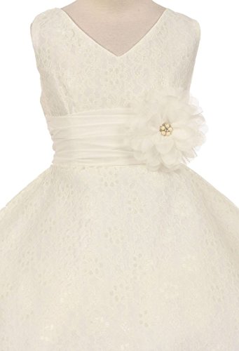V-neck surplice top flower girl dresses in all lace is just what you need to make your event even more special. This girl dress comes with a beautiful flower corsage on waistline to finish the outfit. An absolutely gorgeous special occasion dress for your little girl. This dress is perfect for birthday parties, fomal events, religious occasions, holidays and more.Feature