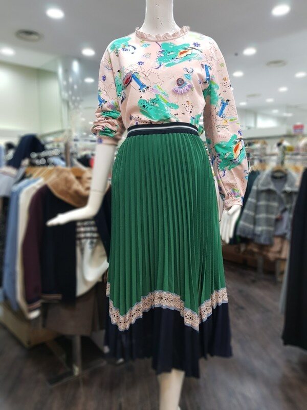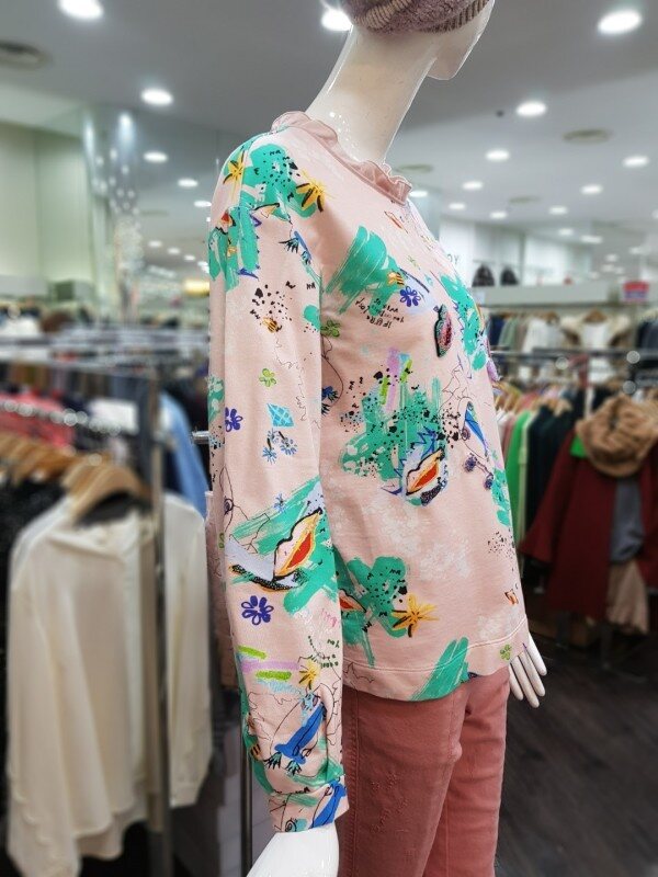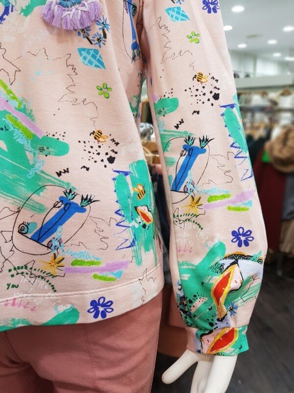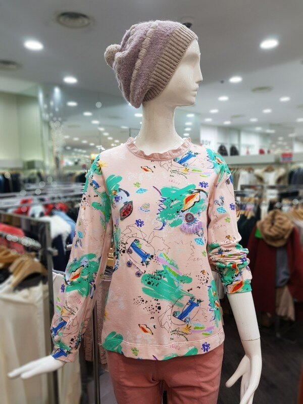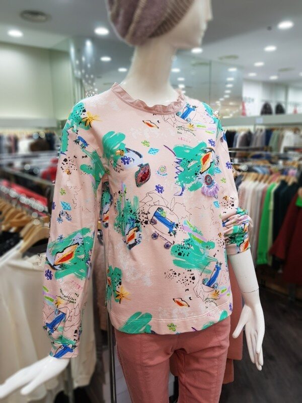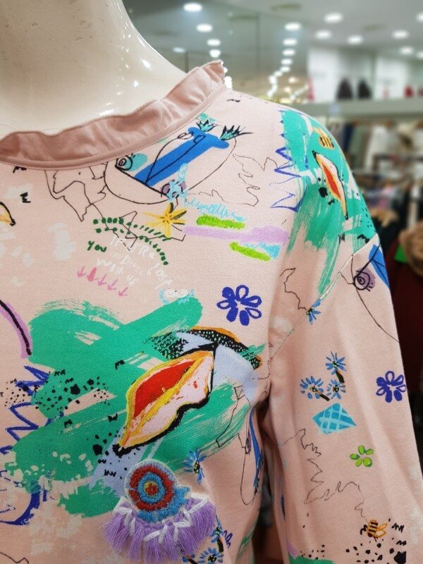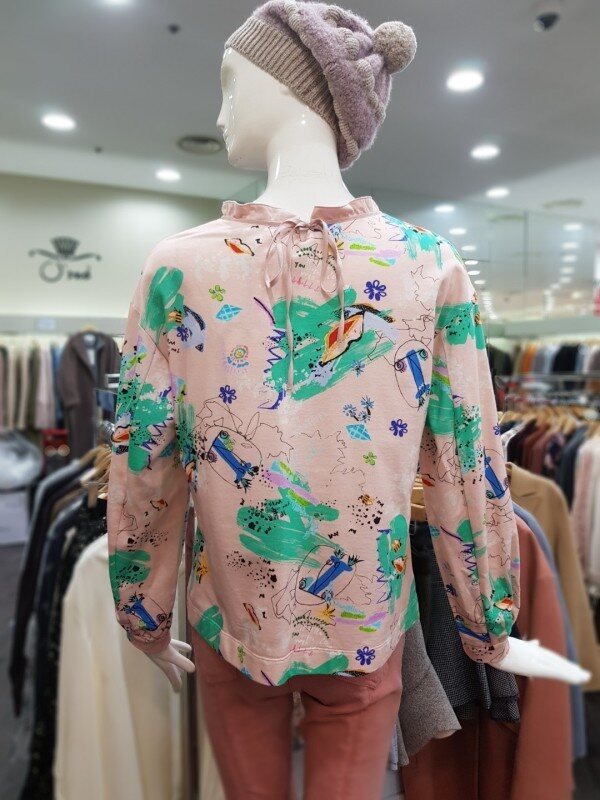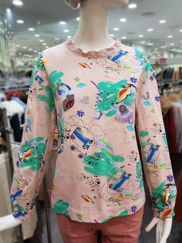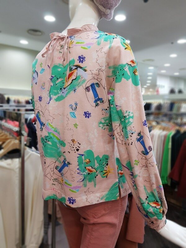 프릴 넥선과 독특하고 화려한 컬러감의 유니크한 티셔츠입니다