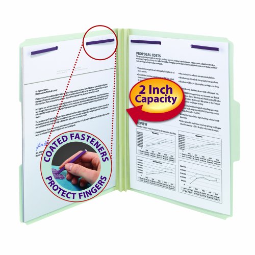 -. Feature : Protect your documents and fingers with Smead's patented SafeSHIELD® Coated Fastener Technology / SafeSHIELD(TM) coated fasteners prevent paper tears, finger cuts and excessive fastener crinkling / Heavy duty pressboard stock and Tyvek® gusset for extra durability / Made for large bulky files that get plenty of use / Two fasteners keep papers secure and in order / Contains 60% recycled content, 30% post-consumer material