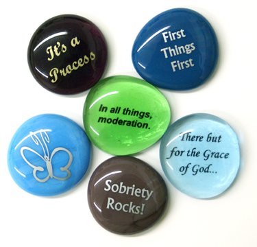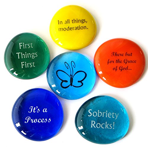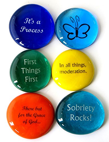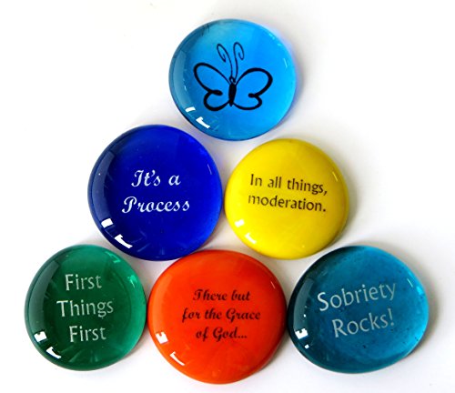 Recovery Stones, 6 Daily Reminders for Encouragement in Sobriety on Glass Stones. Perfect for 12 Step Anniversary Gifts. By Lifeforce Glass. Set II.