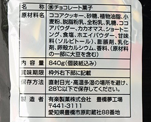 原材料:ココアクッキー、砂糖、植物油脂、小麦粉、脱脂粉乳、全粉乳、乳糖、ココアパウダー、カカオマス、ショートニング、食塩、ホエイパウダー、甘味料(ソルビトール)、膨脹剤、乳化剤、卵殻カルシウム、香料、(原材料の一部に大豆を含む)