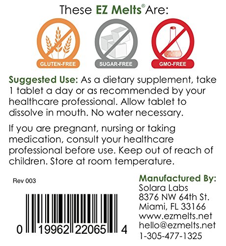 Studio : EZ Melts Publisher : EZ Melts Binding : Health and Beauty Product Description EZ Melts® are a full line of fast melting dietary supplements that are specially formulated to melt in the mouth quickly without the need for water. They are perfect for those who dislike swallowing pills or are prevented from doing so for medical or lifestyle reasons, or simply for those who want the benefits of quality, great tasting supplements. Advantages of EZ Melts®: Tablets melt rapidly in the mouth with a smooth feel - no need for water or swallowing large pills. Active ingredients become readily available for absorption before entering the digestive tract. Great tasting formulas featuring popular ingredients across the spectrum of health categories. We uphold the highest standards of regulatory compliance to ensure that our products are manufactured with safety, integrity and in accordance with the current Good Manufacturing Practices (cGMPs). We are an FDA-registered, USDA-approved facility and have been audited by regulatory authorities. 0