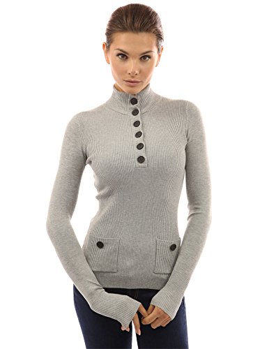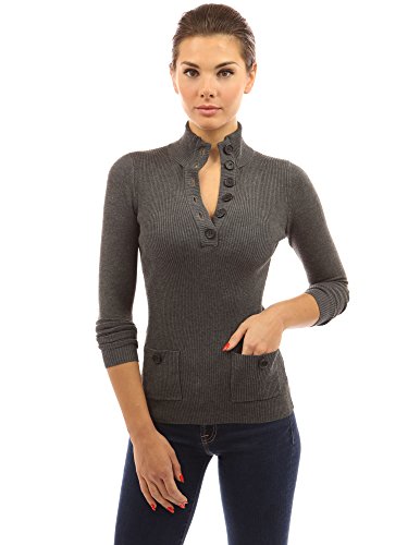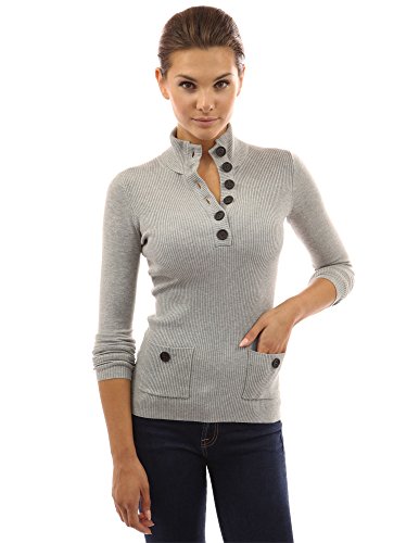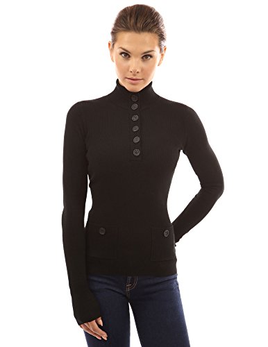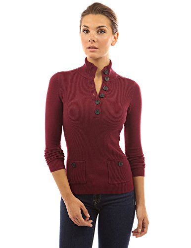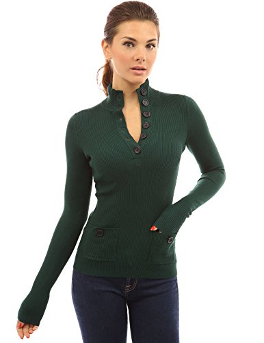 PattyBoutik Stand Collar V Neck Button Pockets Ribbed Long Sleeve Knit Sweater. Model in pictures is 5 feet 8 inches (173cm) tall wearing size S.