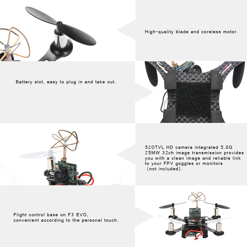 CTW-Mini110 Tiny FPV racing drone RC quadcopter with 520TVL HD camera that is so mini and cute, you only need to be equipped with a remote control and a receiver to experience the indoor FPV flight. A wonderful flying show will be presented!