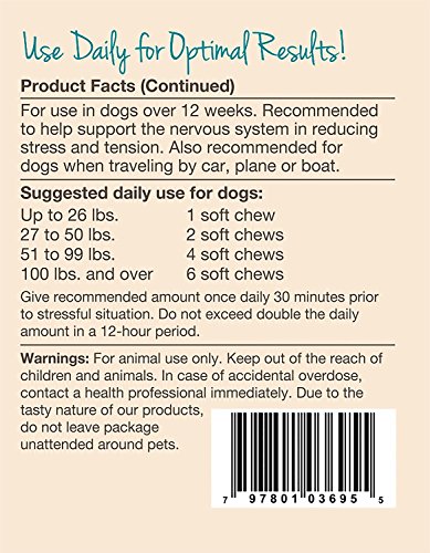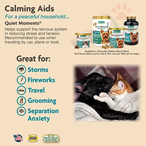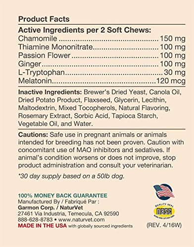 NaturVet Quiet Moments Calming Aid Plus Melatonin Helps Support the Nervous System in Reducing Stress and Tension and Helps Promote Rest and Relaxation. Our Unique Blend of Thiamine and L-tryptophan Helps to Reduce Stress and Tension, Ginger Supports Sensitive Stomachs while Melatonin Helps to Promote Rest and Relaxation. Recommended for Dogs When Traveling by Car, Plane or Boat, also Great for Storms, Fireworks, Grooming or Boarding. Wheat Free, Tasty Soft Chews 70ct for Dogs Over the Age of 12 Weeks. Give 30 Minutes Prior to Stressful Situation. Do Not Exceed Double the Daily Amount in a 12-hour Period. Active Ingredients per 2 Soft Chews: Chamomile, Thiamine Mononitrate, Passion Flower, Ginger, L-Tryptophan and Melatonin. All NaturVet Products are Veterinarian Formulated and Manufactured in the USA in an FDA Audited, cGMP Compliant Facility with a 100% Satisfaction Guarantee.Feature