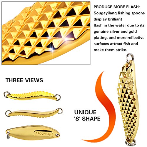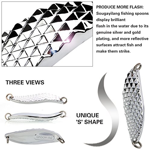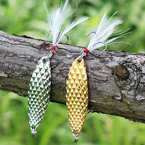 -. Feature : PRODUCE MORE FLASH: Sougayilang fishing spoons display brilliant flash in the water due to its genuine silver and gold plating, and more reflective surfaces attract fish and make them strike. / UNIQUE 'S' SHAPE: Its unique 'S' shape allows it to move in the water like no other spoon. It looks like swimming action and rapid diving action into water. / EXTRA NOISE: The dimpled texture on these spoons creates extra noise and reflects more light in the water to attract fish.The high quality solid brass construction is rust-resistant and durable. / FRIENDLY: water-based environmentally friendly premium paint finishes. / Weight: approx 0.53oz/pc, Length approx 4in including the hook and feather. Pack of 5pcs. Ideal for trout, pickerel, panfish, smallmouth bass, snapperblues etc.