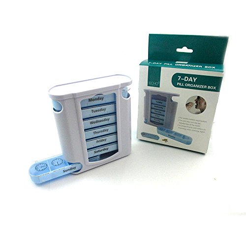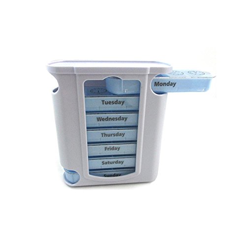 7-Day Pill Organizer Box with removable daily boxes is ideal for weekly tablet organization, and one day bars. Measures 5 X 4.5 X 1.75. Each day slides out for easy access. Just pull it out and take it with you. Great for travel.