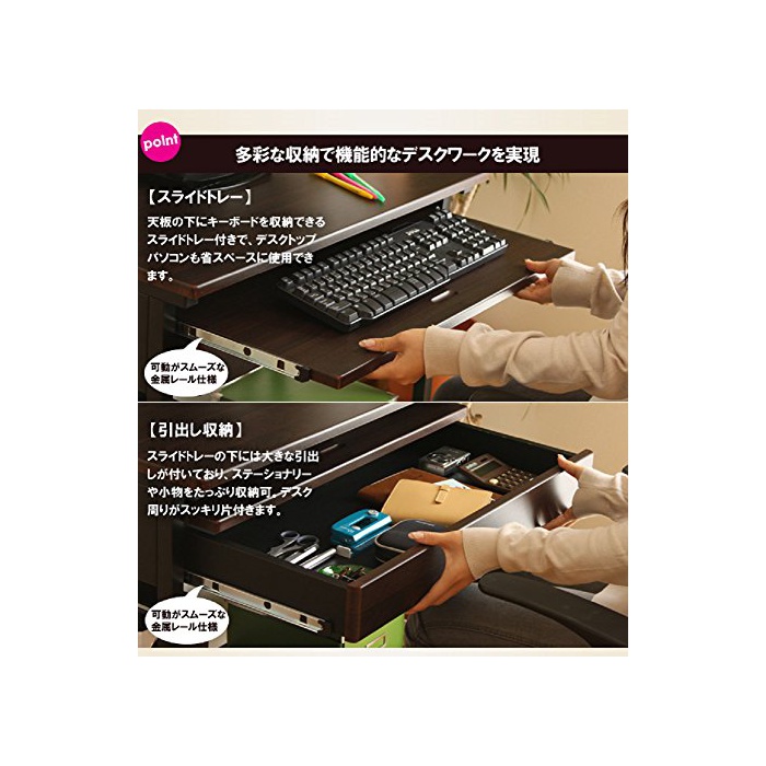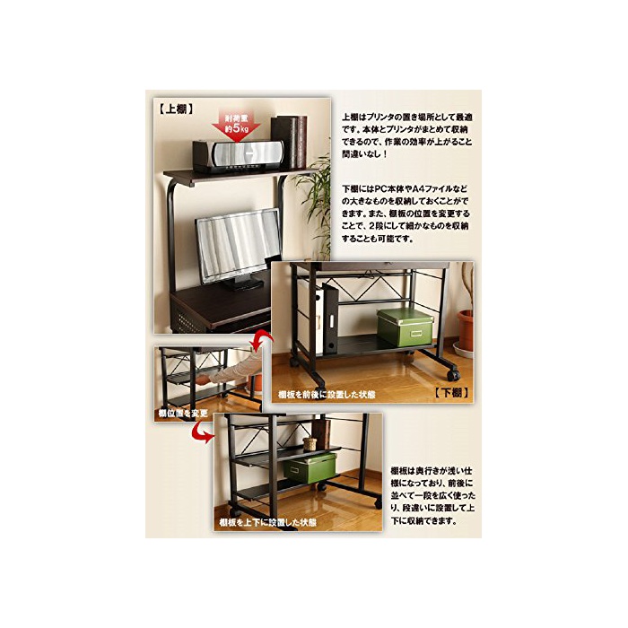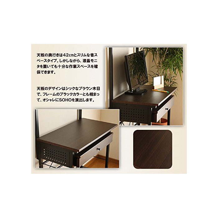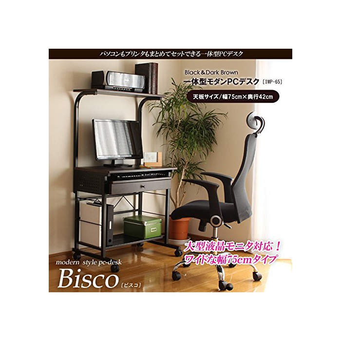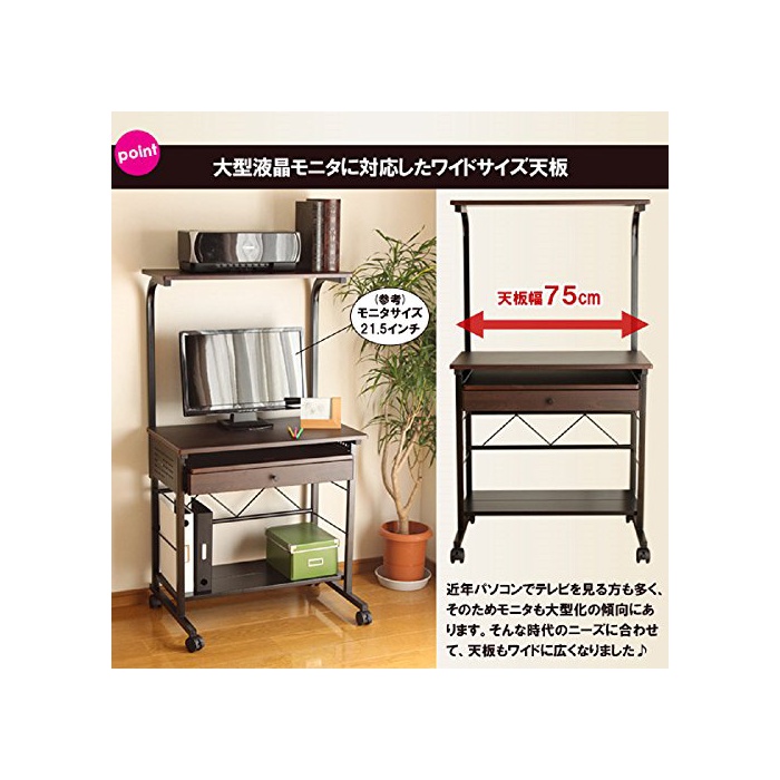 대형 액정 모니터의 설치로도 대응한 와이드인 폭75cm (책상이나 카운터의) 널찍하고 평평한 윗부분의 PC 데스크.상선반,하선반,슬라이드 쟁반,꺼내어 부착과,수납 장소도 충분히 확보.PC,프린터,문구 소품이 이것 1대에 깨끗하게 정리됩니다! 브라운 나무결×블랙 컬러의 쉬크에 세련된 컬러링입니다.