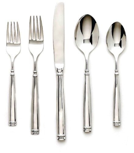 - Set includes eight each of: dinner fork, salad fork, dinner knife, soup spoon and tea spoon plus two serving spoons