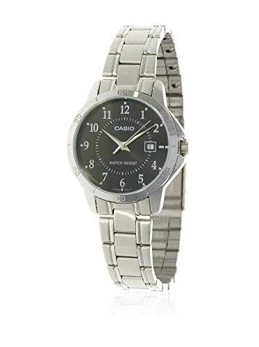 Brand, Seller, or Collection Name:Casio Model number:EAW-LTP-V004D-1BUDF Part Number:LTP-V004D-1 Item Shape:Round Dial window material type:Mineral Display Type:Analog Clasp:Fold-over-clasp Case material:Stainless Steel> Case diameter:25 millimeters Case Thickness:8 millimeters Band Material:Stainless Steel Band width:11 millimeters Band Color:Silver Dial color:Black Bezel material:Stainless steel Calendar:Date Special features:Second hand Movement:Quartz Water resistant depth:30 Meters