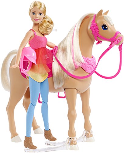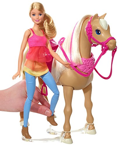 Barbie doll and her horse dance together! There are 3 songs and 3 dances. Inspired by the movie Barbie & Her Sisters in a Puppy Chase. The horse plays three different songs, and Barbie doll and her horse have three different ways to dance. The two can dance together with Barbie doll seated on top in the horse's pink saddle; they can dance together with Barbie doll standing next to her horse; or the horse can dance alone! Activate the dancing with the push of a button on the horse's mane.Feature