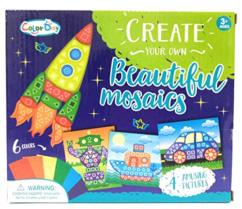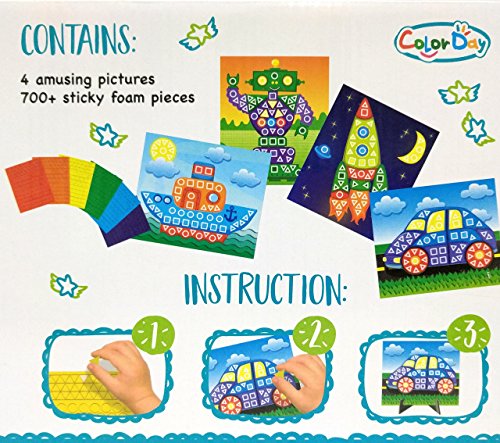 Product DescriptionCreate 4 beautiful mosaic pictures using the included pre-printed rocket, robot, ship, and car boards; as well as the 700 foam stickers. Wonderful project for kids to do.0