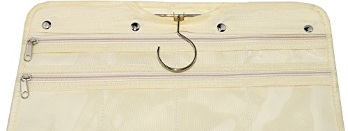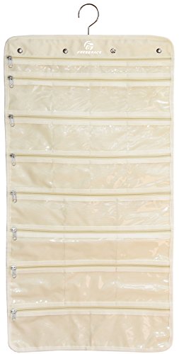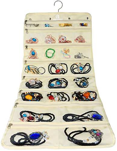 Premium Hanging Jewelry Organizer By Freegrace - Revolving Hanger - Secure Zipper Closure - 50 Pockets/Two-side Pockets - Foldable Storage & Display Solution - Perfect For All Jewelry & Bijoux - Beige