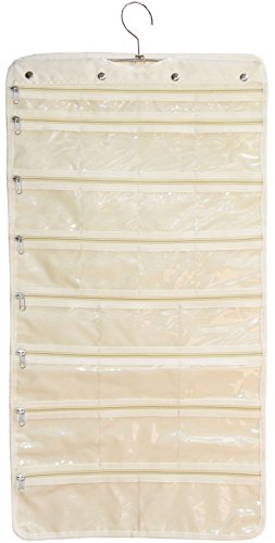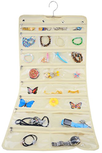 - ✔ DESIGNED FOR PRACTICALITY: The jewelry organizer can be hanged for ease of use or folded and zipped shut for storage. On its one side there are 25 transparent pockets of varying sizes to hold your ring, earrings pins and other small pieces of jewelry. The other side has 23 velcro loops to accommodate your necklaces. See? Everything will finally find its place!