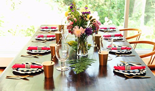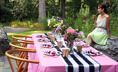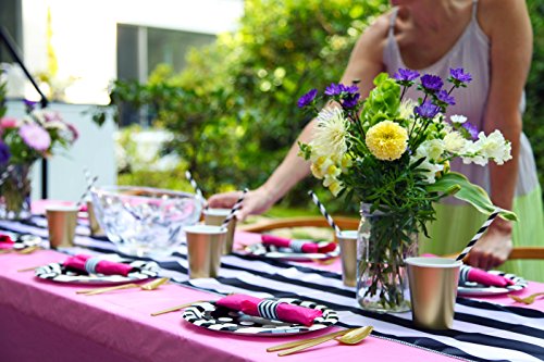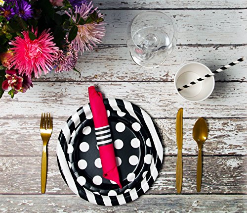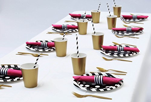 - EASY TO ASSEMBLE We know how valuable your time is so let us help you streamline your day so that it goes off without a hitch. Simply set your party plates , party cups, straws, and wrap your silverware with our party napkins in our easy self adhesive table rings for an elegant touch. Feel free to compliment your table decor with a black and white table runner and tablecloth and then add an accent such as fresh flowers or candles to set the mood for a memorable evening you will never forget