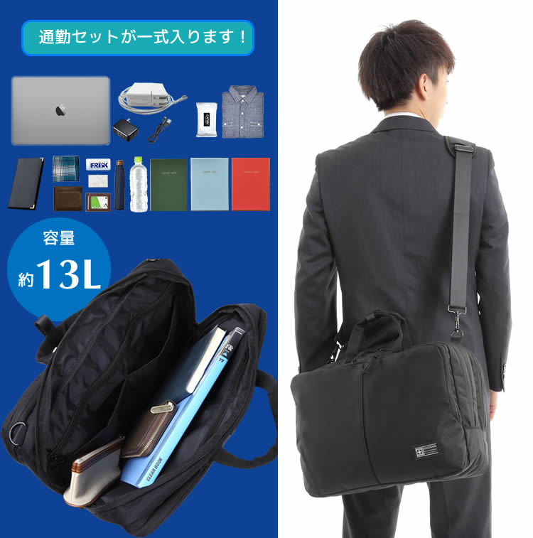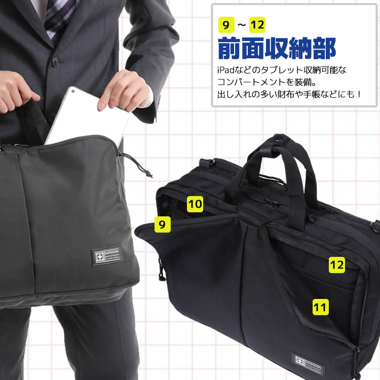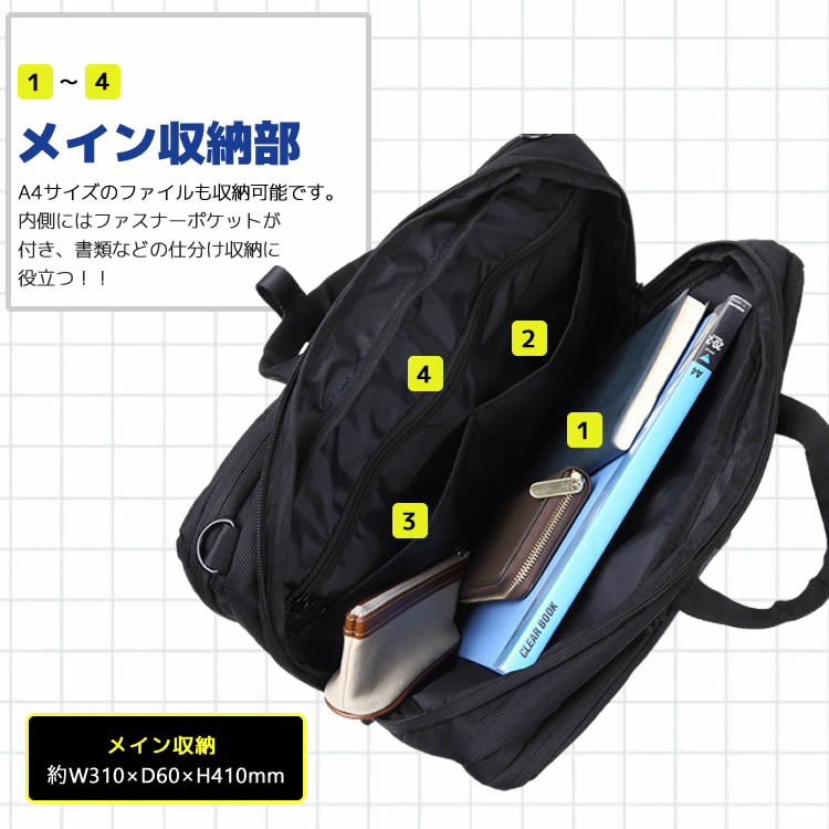 ●手提げタイプ、ショルダータイプ、リュックタイプの3つの使い分けが可能な3WAYビジネスバッグです。