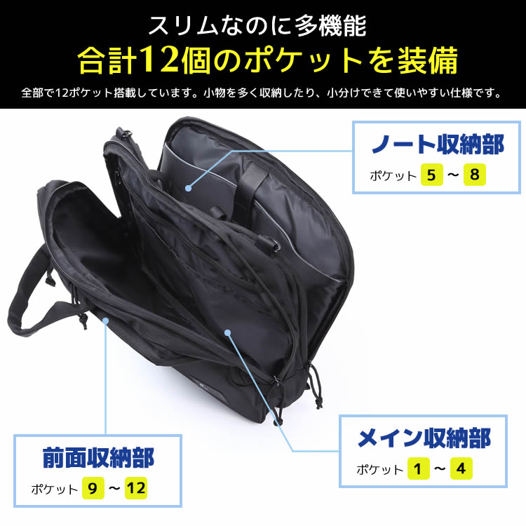 自転車や電車・バス通勤に最適の薄マチ10cm幅。スリムなサイズに、合計12ポケットで小物収納&整理できる、軽量・シンプルデザインのビジネスリュック。