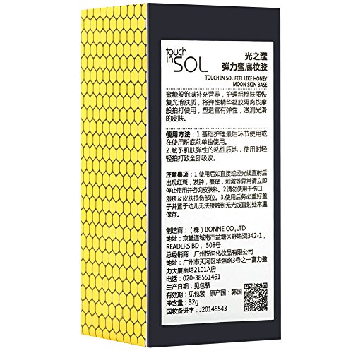 -. Binding : Misc. -. Brand : Touch In Sol -. EAN : 8809239651821 -. Feature : Honey texture firms and vitalizes the skin helping to promote skin's elasticity. / Hydro Complex: hydrolyzed collagen, Hyaluronic Acid, and honey Extract instantaneously works to improve discolored skin while boosting natural radiance. / Great for all skin types / Complex of 4 Flower Extracts helps keep the skin moist while relieving irritations / Repair Complex CLR helps improve skin tone -. Label : Touch In Sol -. Manufacturer : Touch In Sol -. MPN : B00938XJX0 -. NumberOfItems : 10 -. PackageQuantity : 1 -. PartNumber : B00938XJX0 -. ProductGroup : Beauty -. ProductTypeName : BEAUTY -. Publisher : Touch In Sol -. Studio : Touch In Sol -. Title : Touch in Sol Feel Like Honey Moon Skin Base Moisturizer & Makeup Base (1.06 oz)