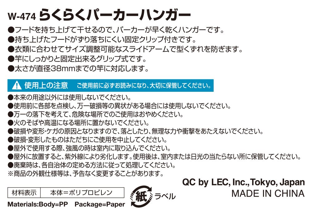 ● Slide arms that can be adjusted in size to suit clothing to prevent the shape collapse.
