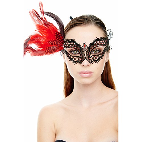 -. Feature : Seductive, sexy and vampish - all rolled in to one - with lacey, butterfly-like wings, sweeping eye lids, real feathers at the temple and pointed-back rhinestones / Your eco friendly, lightweight, metal alloy mask will never flake or discolor and is adorned with genuine Preciosa sparkly pointed-back rhinestones / Featherweight, adjustable metal alloy is intricately laser cut to a paper thin filigree resembling lace and yet it's extremely strong / Just bend and shape to suit your face shape and hold in place with the double-faced satin ribbons so it's comfortable all night long / Other colors and styles for men, women & teens available under separate listings including Vixen, Skull, Phantom, Impish, Sinful and many more.