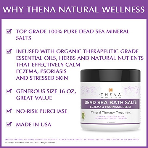 INSTANTLY CALM ITCHY, SENSITIVE SKIN - Gentle soothing bath with proven soothing itch relief 100% pure natural colloidal oatmeal, organic manuka honey, lavender, rosemary for long lasting relief from eczema, psoriasis, dermatitis, rashes, skin irritation, poison ivy, prickly heat, chicken pox, hives, insect bites, severely dry skin, 100% Natural Dead Sea Bath Salts have been proven and recommended by the international psoriasis community as an effective alternative treatment and skin protection.