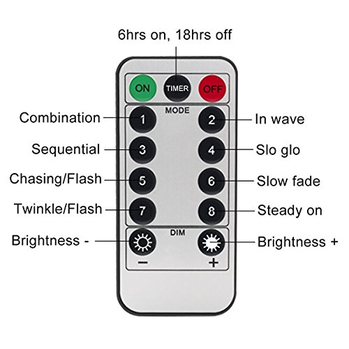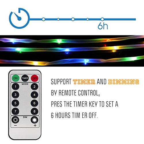 - Easy to Operate and Carry: Battery powered string lights, just put on batteries and turn it on! Comes with a 13-key remote controller, which make modes selected, brightness adjusted, and timer setting are easily controlled. Remote control is designed with timing function to avoid forgetting to turn off the lights, you can set an auto-cycle on –off timer which is 6 hours on and 18 hours off per day by just easily pressing the “TIMER” key. Little volume and light weight after rolling up, very conv
