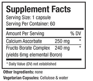 -. Feature : A natural food form of the mineral boron / Exceptionally bio-available / NO excipients. 60 capsules per bottle. 500 mg per vegetarian capsule / 240 mg fructoborate + 260 mg calcium ascorbate per veggie cap / Each capsule supplies 6mg of elemental boron