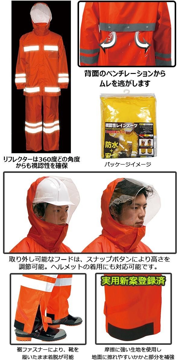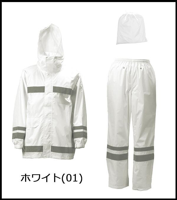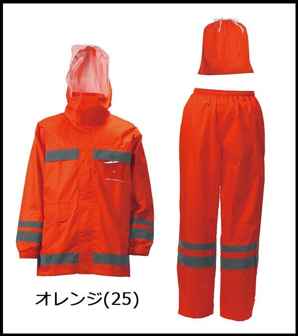 | 夜間や悪天候時の作業などに。胸・背中・腕・肘・裾に再帰反射テープを装備した、視認性の良いレインスーツです。収納もコンパクト!! |