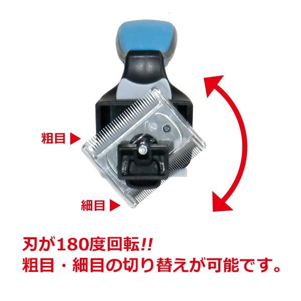 刃が180度回転する、シェッディングブラシです。粗目・細目の切替が可能で、刈れた毛はプッシュボタンで簡単に取り除けます。小型犬におすすめのサイズです。 |