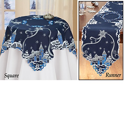 Studio : Collections Etc Publisher : Collections Etc Product Description Snowy Night Christmas Town Table Linens, Runner Description A unique embroidered design features a charming village on a snowy winter night. This beautiful design features white, blue and silver embroidered details against a rich navy blue background. Display alone or with coordinating tablecloths underneath (sold separately). Machine wash. Polyester; imported. Available either as a Runner (68"L x 13"W) or a Square (34"Sq.). Shop Coordinating Items [ TIP: Type the product name and item # into the search box ] - Basic Rectangular Tablecloth (Item #29334)