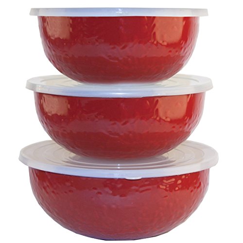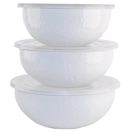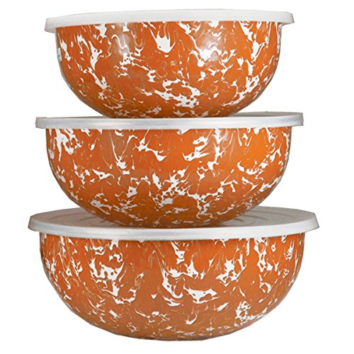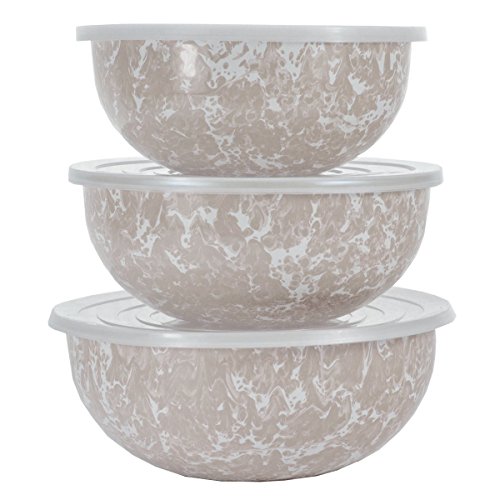 Golden Rabbit 10.5"X10.5"X10.5" Taupe swirl enamelware mixing bowls. This enamelware is made of carbon steel coated with a porcelain enamel and trimmed in stainless steel. There will be variations in the shading of colors and pattern formations which are the results of the hand-dipped process. Golden Rabbit enamelware is created using a traditional handmade production method that has changed very little since the late 18th century. Each piece is hand-dipped and fired at extremely high temperatures causing the steel to Contract and fusing the porcelain enamel to the steel, creating a durable, non-porous surface.Feature