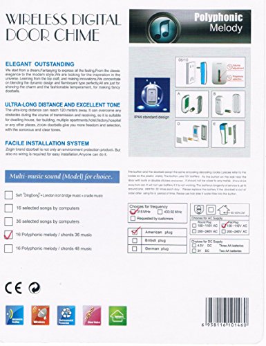 -. Brand : YP -. Feature : AC 2 flat plug in Receiver with flash light,waterproof transmitter / Sound up to 105dbs,36 pcs ringtones in storage;operating range(open area):200M / Hight low volume adjustable / Using it worry free with factory 2 year quality warranty -. Label : Yunzhicheng -. Manufacturer : Yunzhicheng -. ProductGroup : Home Improvement -. ProductTypeName : HOME_LIGHTING_ACCESSORY -. Publisher : Yunzhicheng -. Studio : Yunzhicheng -. Title : Wireless Door Bell Guest Chime with Water Proof Tansmitter
