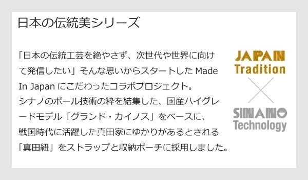 Made In Japanのコラボステッキです。真田氏ゆかりの真田紐をストラップと、専用ポーチに採用。また専用ポーチは児島ジーンズの上質なデニム地を使用しています。先進のポール技術と、伝統工芸のコラボレーションをお楽しみ頂ける逸品です。 |