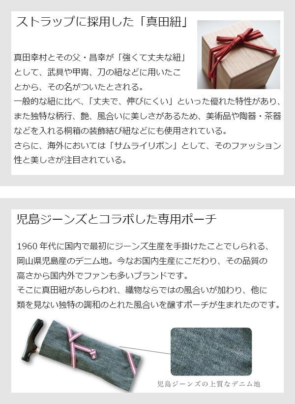 | Made In Japanのコラボステッキです。真田氏ゆかりの真田紐をストラップと、専用ポーチに採用。また専用ポーチは児島ジーンズの上質なデニム地を使用しています。先進のポール技術と、伝統工芸のコラボレーションをお楽しみ頂ける逸品です。 |