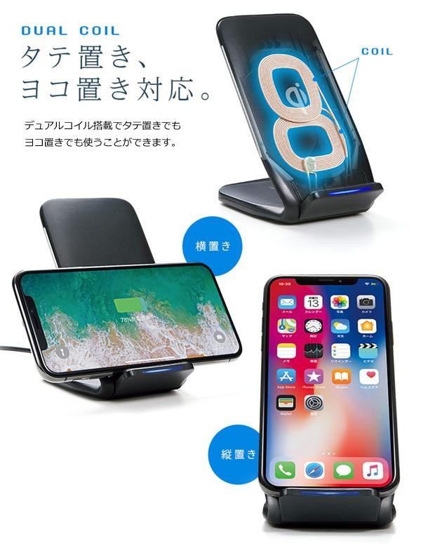 | ワイヤレス充電の規格「Qi(チー)」に準拠したワイヤレス充電スタンドです。Qi(チー)規格に準拠したスマートフォンなどを置くだけで充電することができるので、充電ケーブルに接続する必要がありません。充電しながらでもスマートフォンを使用することができるスタンドタイプです。 |