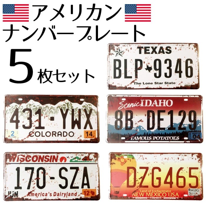 送料無料でお届けアメリカンヴィンテージ風ナンバープレート(5枚セット) コロラド・テキサス・アイダホ・ニューメキシコ・ウィスコンシンの5枚セット サイズ:約 30.5cm x 15.5cm プレートの種類により多少サイズが異なる場合がございます。 お部屋のインテリアだけでなく、ショップやガレージ、カフェなどあらゆるところにアメリカンビンテージのプレートはいかがでしょうか。