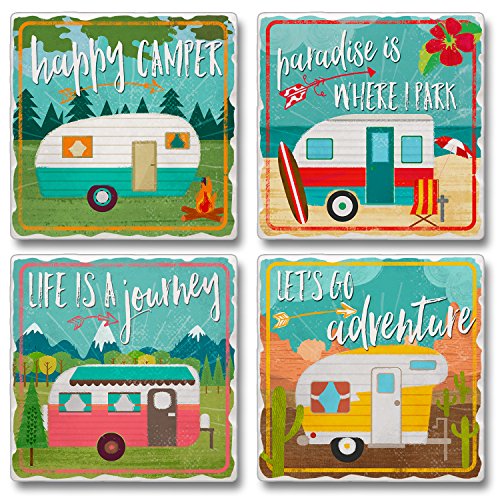Studio : Highland Graphics Publisher : Highland Graphics Product Description This Set of 4 Camper Tumbled Stone Coasters will cheer up any tabletop in your home with their vibrant colors and happy phrases. Four different designs are included in this set; one says "happy camper," one says "paradise is where I park," one says "life is a journey" and one says "let's go adventure." All four coasters are equally cute and we're sure that you'll love their bright hues and fun designs. Just imagine how great they would look on your coffee table, dinner table, nightstand, etc. You could also purchase them as a pretty yet practical housewarming gift for any friend or family member with a camper. 0