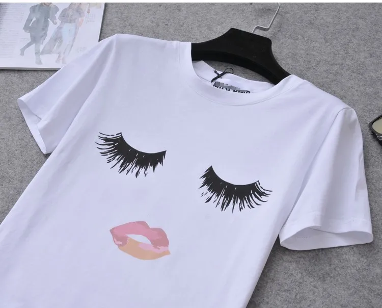 2016 Fashion Women T Shirt White Loose Crew Neck Short Sleeve Summer Tops Cute Eyelashes Lips Print Femininas Blusas Size S-L