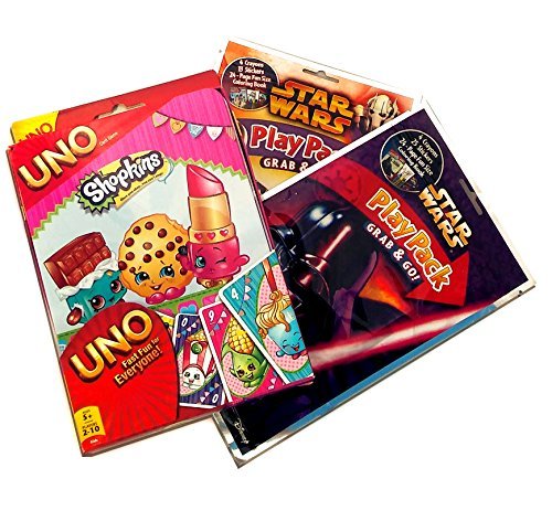 Enjoy some fast-paced family fun with the classic card game, UNO! This includes the collectible Shopkins version 112-card Uno deck, instructions all packaged in a commemorative game tin. Also included are TWO Star Wars Grab & Go Play Packs that each includes 4 crayons (Red, Yellow, Green, And Blue), 1 Sheet of Stickers, and a 24 Page Fun Size Coloring Book.
