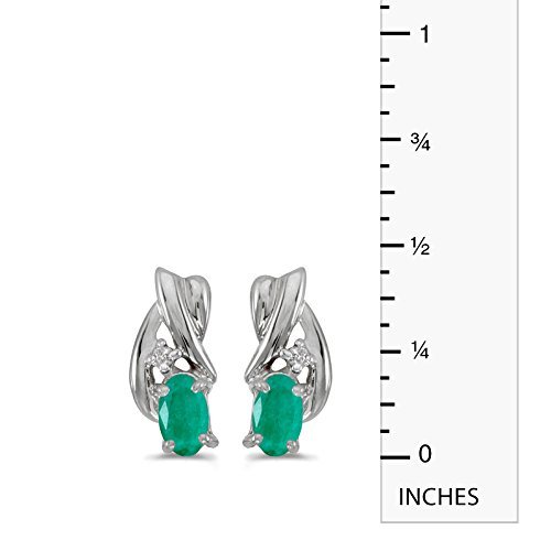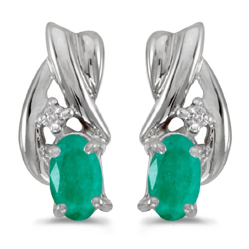 These 14k white gold oval emerald and diamond earrings feature 5x3 mm genuine natural emeralds with a 0.32 ct total weight and bright diamonds.