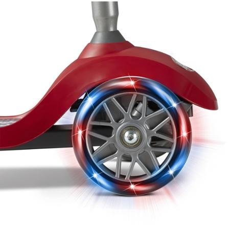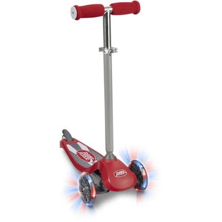 -. Feature : 3-wheel red Radio Flyer scooter High-performance urethane wheels / Wheels light up with speed Fast, smooth ride / Heavy-duty deck that can handle the growing weight of a child Adjustable handle bar to make it easier for smaller or taller children to hold / Lean-to-steer technology for improved handling Foot brake for added control and quick stopping / Soft foam hand grips for a comfortable ride with easier balance and control Age range: 3 years and up