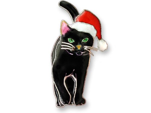 Kitty is all decked out for the holidays. This hand-painted enamel on sterling silver pin was designed by artist Marilyn Grame. It makes a great gift for the Christmas lover, holiday lover or anyone who appreciates fine jewelry. The pin measures approximately 1 3/4" by 7/8." Master artisans paint each article by hand using solutions containing colored granules of glass. Next, they fire the pieces in a kiln to produce an alluring richness of color. Some designs are then plated in 24-karat gold, and some are complemented with beads or semi-precious stones. This process creates the unique Zarah look.Feature