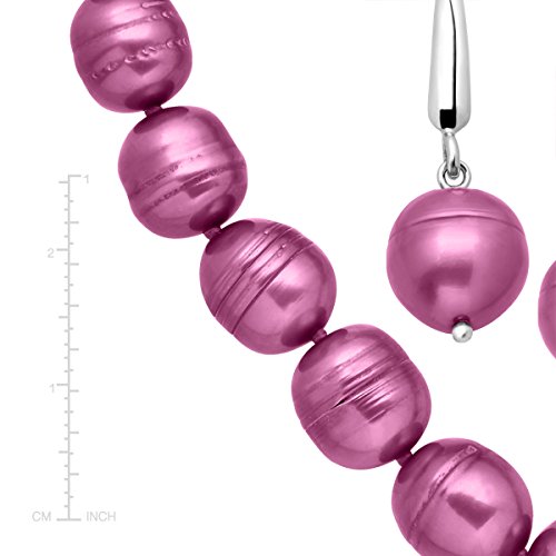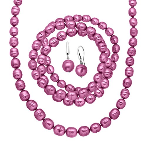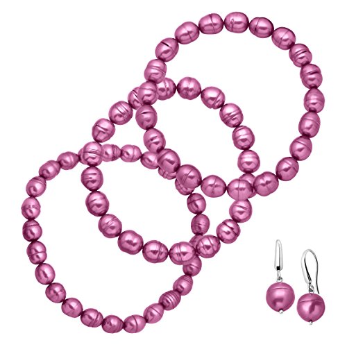 Make a statement in this fuchsia ringed cultured pearl ensemble. Necklace features a graduating design and bracelets feature a stretch design for complete comfort. The balls of the earrings hang on "thin at top, thick at bottom" style hook for a metal-heavy look. Earrings measure 1 1/4 by 5/16 inches and feature fish hook back-findings. Bracelet measures 7 1/4 inches in circumference. Necklace measures 20 inches in length, finished with a lobster claw clasp. Pearls have been dyed to enhance their appearance.Feature