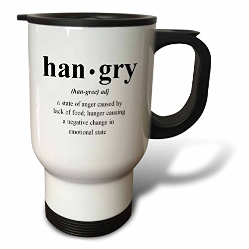 Hangry a state of anger caused by lack of food. Hangry definition. Hungry Travel Mug is a great way to take your favorite hot or cold drink along. With a tapered bottom this stylish 14oz mug fits in a standard cup holder and features an easy-grip handle with thumb rest, slide opening lid and slanted drinking surface. This travel mug is made of stainless steel. Not microwave safe, hand washing is recommended.Feature