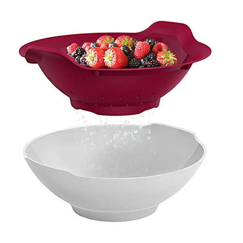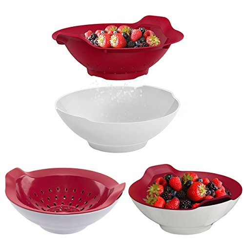 3 Sets of red baskets with slotted holes to strain berries, white bowls to serve; Bowl allows food to soak for a better clean; After soaking, lift colander to strain into bowl